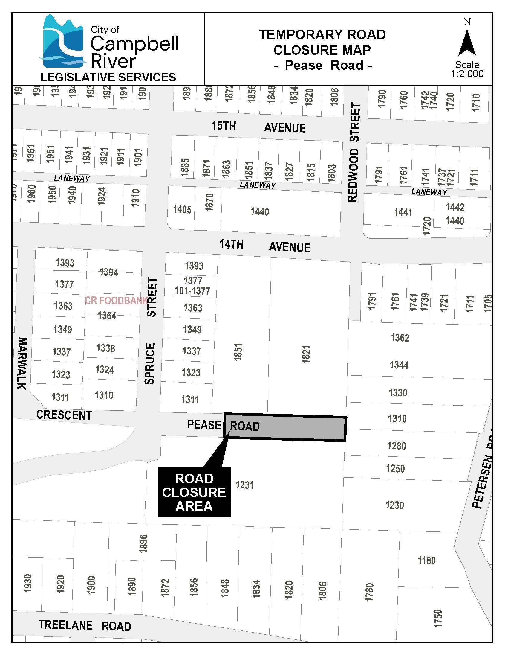 This would remove the highway dedication for this portion of road (dedicated by Plan 15486, District Lots 1393 and 66, Sayward District) and will require adoption of Road Closure and Dedication Removal (Portion of Pease Road) Bylaw No. 4000, 2025.